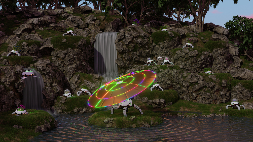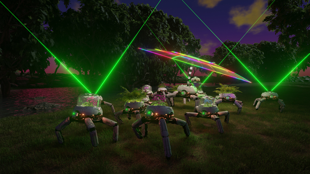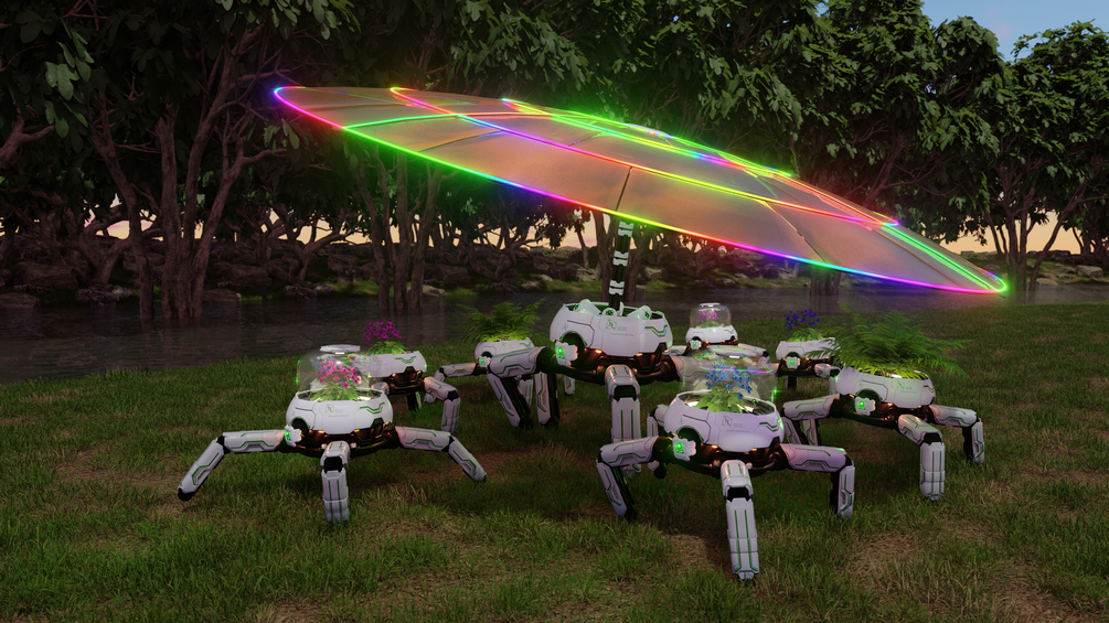 A flock of Solarpunk Robots bring the beauty of nature to party along with them!